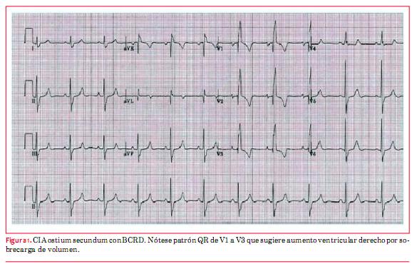 La comunicación interauricular (CIA) es por lejos la CC que con mayor frecuencia alcanza la edad adulta. Los hallazgos electrocardiográficos típicos de la CIA, tipo ostium secundum (OS), el más común de estos defectos, son la desviación del eje eléctrico del QRS a derecha y el bloqueo de rama derecha(2) (figura 1). Cohen y colaboradores describen que encontrar una muesca en el sector superior de la onda R en derivaciones inferiores tiene alta especificidad para el diagnóstico de CIA OS(3). Esto tiene poca sensibilidad. Se pueden observar ondas P picudas en DII como elemento sugestivo de auriculomegalia derecha. Niños con defecto tipo OS generalmente se presentan con ritmo sinusal, en cambio los adultos que mantienen este defecto sin reparar tienen mayor incidencia de fibrilación auricular (FA) (hasta un tercio de los pacientes mayores de 40 años), de flutter y de bradicardia sinusal con ritmo de escape unional. El cierre quirúrgico de esta comunicación disminuye la incidencia de flutter, pero no de la FA.
