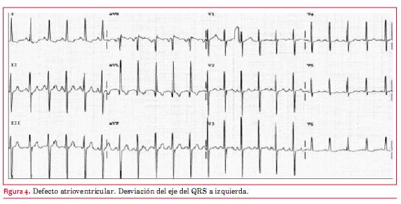 El defecto atrioventricular es la cardiopatía típica del síndrome de Down (aunque puede tener otras cardiopatías o asociaciones, como la tetralogía de Fallot). La mayoría de los pacientes han sido intervenidos en la infancia y algunos reintervenidos por insuficiencia de la válvula AV o por una estenosis subaórtica que a veces se desarrolla en la evolución. Los no operados tienen invariablemente una enfermedad vascular pulmonar obstructiva. Típicamente muestran en el ECG desviación del eje eléctrico del QRS a izquierda (figura 4). Agrandamiento de la aurícula izquierda e hipertrofia del ventrículo izquierdo (HVI) pueden estar presentes si hay una importante regurgitación de la válvula AV. Cuando se asocia una estenosis del tracto de salida del VD o en los no operados que tienen hipertensión pulmonar con fisiología de Eisenmenger predomina la hipertrofia ventricular derecha (HVD). Flutter y FA pueden ocurrir en pacientes mayores(2). Puede verse también bloqueo AV de primer grado. Se aconseja la realización de Holter periódico para descartar grados mayores de bloqueo AV.
