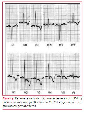 Cuando la obstrucción es de grado severo pueden visualizarse ondas R puras (R en V1 > 20 mm) (9), complejos QR o RS en V4R y V1 y ocasionalmente también patrón de sobrecarga derecha (figura 5). Ocasionalmente se ve crecimiento auricular derecho que se visualiza como una onda P picuda en DII y V1. La altura de la onda R multiplicada por 5 da una estimación de la presión sistólica del VD en mmHg(10).