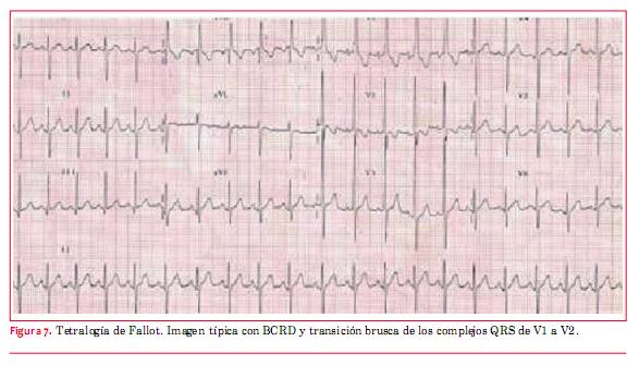 La imagen característica del ECG en la tetralogía de Fallot muestra una HVD con imagen de BCRD del haz de His y transición brusca en V1-V2 (qR o Rs a RS) (figura 7). En aquellos pacientes que fueron reparados con parche transanular, como era la norma antes de 1990, el BCRD está casi siempre presente y puede reflejar el grado de dilatación del VD.