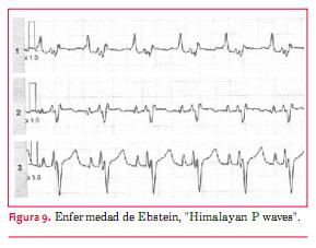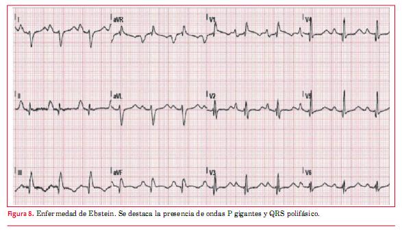 El ECG muestra típicamente un agrandamiento de AD con ondas P gigantes (Himalayan P waves) (figuras 8 y 9). También son característicos bajos voltajes de QRS y BCRD con complejos que a veces son polifásicos (rsr’r’’). Puede verse imagen de tipo QR en precordiales derechas debido a la auriculomegalia derecha que permite ver potenciales intracavitarios en dichas derivaciones. El 25% de los pacientes pueden tener un síndrome de preexcitación tipo Wolff-Parkinson-White asociado a veces con vías accesorias múltiples, la mayoría de las cuales están situadas del lado derecho(2).