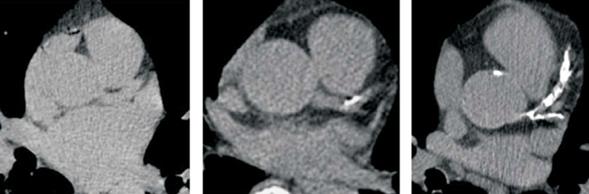 Figura 2: Ejemplos de diferentes grados de score de calcio coronario: a la izquierda, ausencia de placas calcificadas (score 0). En el centro, score de calcio < 100 UA, con placa calcificada en el inicio de la arteria descendente anterior. A la derecha, score de calcio > 300 UA, con placas calcificadas a nivel de tronco de coronaria izquierda, descendente anterior y circunfleja.