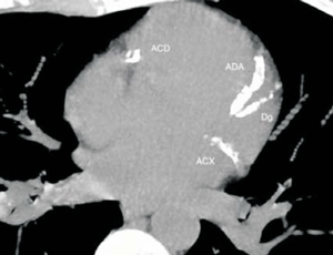 Figura 3: Se observa calcificación coronaria a nivel de las tres arterias principales. Según el sistema CAC-RADS, se reportaría un score > 300 UA, que compromete la arteria coronaria derecha (ACD), arteria descendente anterior (ADA) y arteria circunfleja (ACX), por lo tanto, CAC- RADS A3/N3.