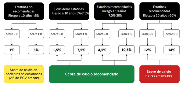 Las guías de prevención CV primaria de la ACC/AHA 201935 le asignan una recomendación clase IIa, con nivel de evidencia B-NR, en adultos con riesgo intermedio o con riesgo borderline (5%-7,5%) seleccionados, si la decisión sobre el tratamiento, por ejemplo, inicio de estatinas, es incierta. En individuos de bajo riesgo CV seleccionados, con menos de 5% de riesgo a diez años, como aquellos con antecedentes familiares de enfermedad CV precoz, el SCC podría ser considerado. Si es 0, es razonable no iniciar estatinas y reevaluar entre los cinco y diez años, siempre y cuando el individuo no tenga condiciones de mayor riesgo como diabetes, tabaquismo o antecedentes de enfermedad CV prematura. Si es 1-99 UA, es razonable iniciar estatinas, especialmente en los mayores de 55 años. Si el SCC >100 UA o > percentil 75, es razonable iniciar tratamiento con estatinas.