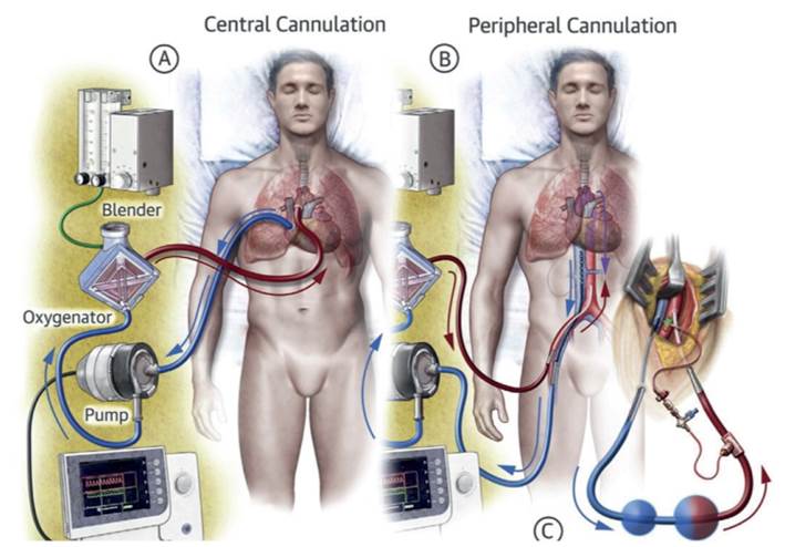 Figura 1: Canulación básica para ECMO veno-arterial. A) Canulación central. B) Canulación periférica. Tomado de 3.