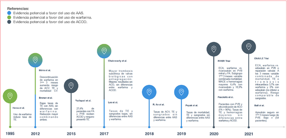 La evidencia en los últimos años respecto al uso de ACOD en patologías que requieren ACO como FA17,31-33, embolia pulmonar34 e incluso en el contexto de cardiopatía isquémica35,36 no se centra específicamente en su utilidad en individuos con PVB o reparación valvular previa, pero ha funcionado como disparador para distintos análisis y estudios posteriores en este subgrupo tan particular de pacientes. Los estudios generalmente se centraron en pacientes con FA no valvular (según la terminología clásica), por lo que muchas veces por diferencias en las definiciones, no se incluían individuos portadores de PVB. Sin embargo, se han logrado recabar ciertos datos de utilidad de los estudios más icónicos sobre ACOD en FA para poderlos aplicar en esta etapa del posoperatorio tardío en pacientes con prótesis biológicas.