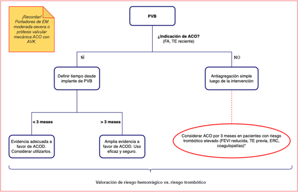 Hemos realizado un análisis en profundidad respecto al riesgo trombótico que acarrea el hecho de ser portador de una PVB, sumado muchas veces a condiciones adicionales con riesgo sobreagregado. Esto conlleva una situación clínica de difícil manejo al momento de decidir el tratamiento antitrombótico coadyuvante, la evidencia hoy en día persiste en controversia. A pesar de esto, la tendencia actual al uso más frecuente de ACOD también se está dirigiendo a la inclusión de los pacientes con PVB. Esta población incluye un número importante de pacientes, y más aún son aquellos que presentan FA concomitantemente, la afectación más frecuente que agrega riesgo trombótico al panorama clínico del individuo.