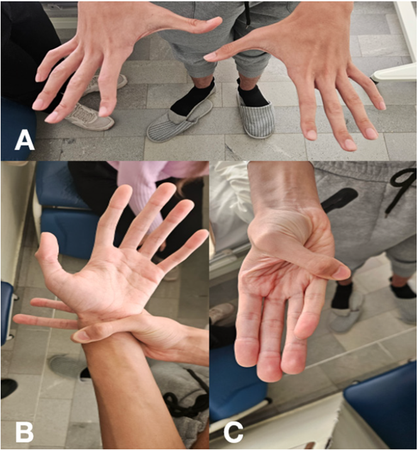 Figura 1 Examen físico osteoarticular. Evidenciamos los principales signos osteoarticulares sugestivos del síndrome de Marfan. A. Aracnodactilia. B. Superposición del dedo pulgar y meñique al hacer prehensión de la muñeca (signo de la muñeca o Walker-Murdoch). C. Protrusión del pulgar en oposición forzada más allá del borde cubital de la mano (signo del pulgar o Steinberg).