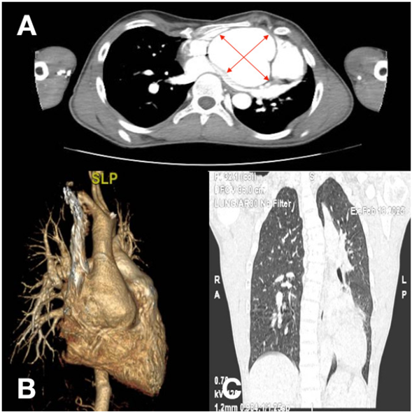 Figura 2 Angiotomografía de aorta. A. Corte tomográfico a nivel de la raíz aórtica que evidencia clara dilatación aneurismática a nivel sinusal con medidas de hasta 67,5 mm (flechas rojas). B. Reconstrucción tomográfica tridimen sional con mayor detalle y resolución espacial. Muestra cómo la dilatación aneurismática se encuentra confinada a la raíz aórtica con preservación de los restantes segmentos distales. C. Corte anteroposterior del cual destacamos la desviación significativa de la columna vertebral a izquierda (parte de los criterios diagnósticos osteoarticulares).
