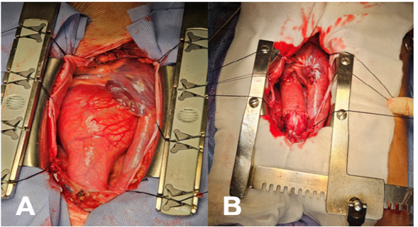 En este contexto, se decidió intervenir de forma quirúrgica: se realizó sustitución de la raíz aórtica por tubo valvulado n.o 27 mediante técnica de Bentall-de Bono (Figura 3). Presentó una adecuada evolución posoperatoria, con estabilidad clínica y sin alteraciones de la herida quirúrgica. El ETT de control mostraba función sistólica biventricular conservada con el tubo valvulado normoposicionado normofuncionante. Finalmente, se otorgó el alta domiciliaria bajo anticoagulación, bisoprolol y valsartán a bajas dosis con controles posteriores en policlínica de cardiología.