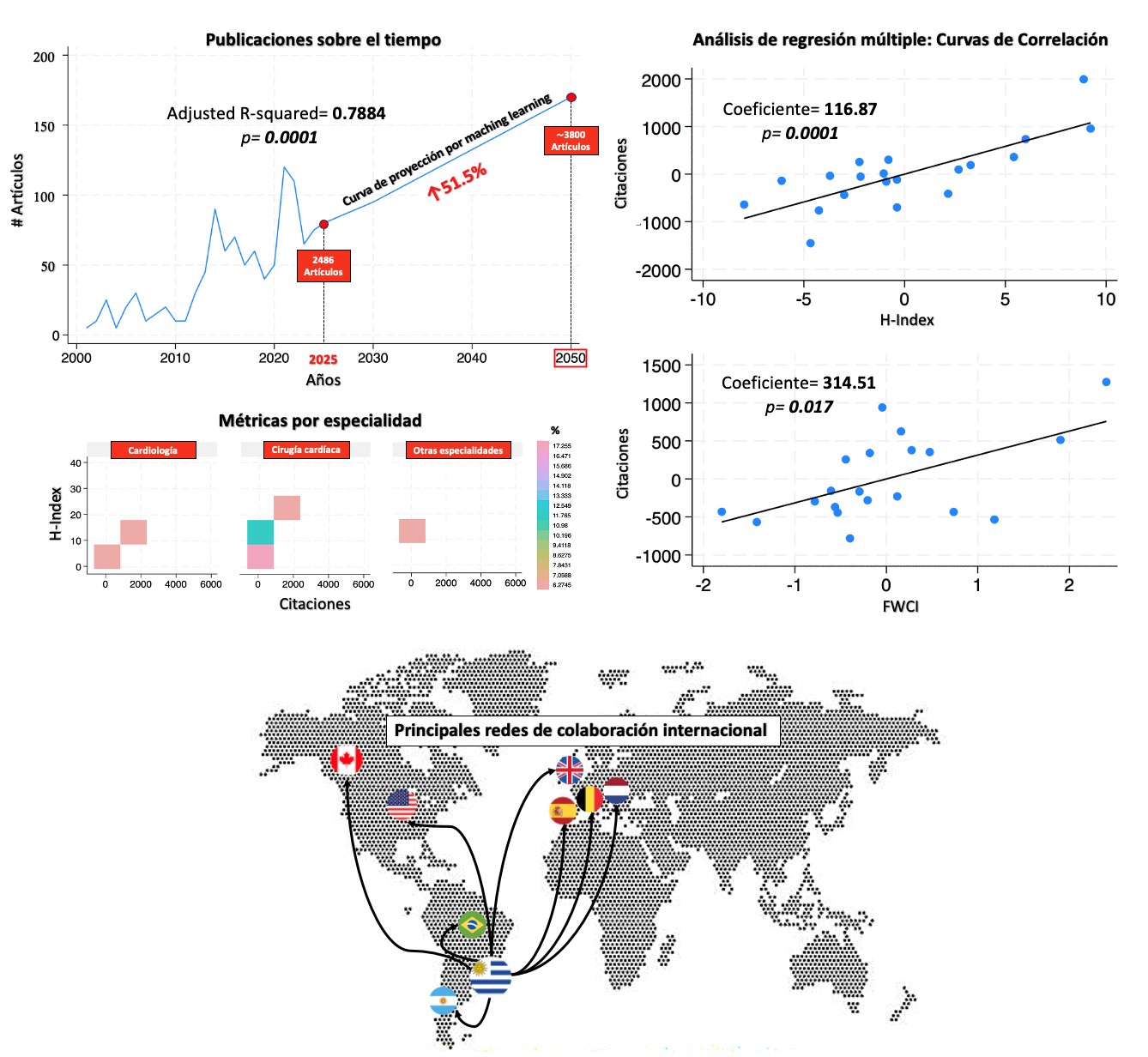 En conclusión, nuestro estudio bibliométrico ofrece por primera vez una visión integral de la investigación cardiovascular uruguaya y los resultados evidencian un crecimiento sostenido pero desigual, con áreas de oportunidad claras en cuanto a equidad de género, financiamiento y colaboraciones internacionales. Las proyecciones hacia 2050 son alentadoras, pero requieren de intervenciones estratégicas para materializarse plenamente.