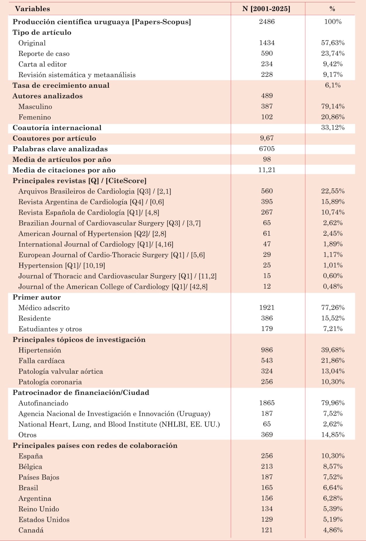 La presente carta tiene como objetivo presentar un breve análisis detallado de la producción científica uruguaya en el campo de la salud cardiovascular, que abarca tanto la cardiología como la cirugía cardíaca, a partir de un enfoque bibliométrico-visual. Este estudio cubrió el período 2001-2025 y es el primero de su tipo en el país. Nosotros consideramos que esta iniciativa proporcionará una visión integral del estado actual y las tendencias futuras de la investigación científica en este ámbito.