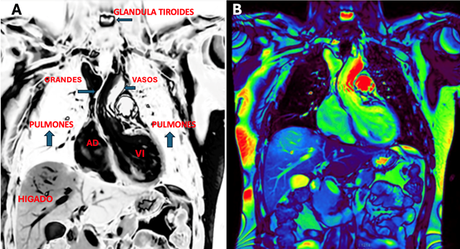 Figura 1 Comparación de las vistas de resonancia cardíaca. A: Imagen en blanco y negro (sangre negra). B: Uso de coloración que muestra las estructuras torácicas y cavidades cardíacas en corte coronal. El filtro de color mejora la visualización anatómica, lo que permite una mejor distinción de las estructuras. Imagen realizada en el Hospital Clínico San Carlos, Madrid, España. Autoría propia: Jaime Andrés Nieto Zárate.