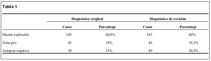 Hubo concordancia con el diagnóstico inicial de categoría muerte explicable, autopsia negativa y zona gris en 229 de 238 casos (96,2%). Con el diagnóstico revisado la ME pasó de 145 a 143 casos (60,9% a 60%). La ZG pasó de 43 a 46 casos (de 18% a 19,3%). La AN de 50 a 49 casos (de 21% a 20,5%).