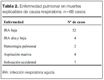 De los 238 casos revisados, hubo afectación pulmonar causante de la muerte en 69 pacientes, 29,1% de la casuística. La causa respiratoria constituyó 48,2% de las muertes explicables (tabla 2).