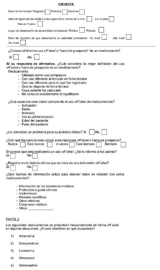 Se desconoce el conocimiento que tienen los pediatras sobre este tema en nuestro medio. En función de estas consideraciones, se diseñó una investigación para intentar responder las siguientes interrogantes: los profesionales que asisten niños, ¿conocen todas las dimensiones del concepto off label?, ¿identifican usos off label en medicamentos de prescripción frecuente en pediatría?, ¿solicitan consentimiento informado?