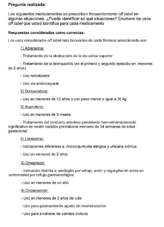 Para indagar el conocimiento sobre la prescripción off label se incluyeron preguntas dirigidas a explorar si conocían el término off label o “fuera de prospecto” y su definición; en caso afirmativo si lo podían conceptualizar en todas sus dimensiones (indicación, dosis, intervalo, vía de administración, edad o peso) y si lo consideraban un problema en su práctica clínica. Se indagaron, además, las prácticas frente a la prescripción off label: frecuencia de la prescripción, información a los padres, registro en historia clínica y fuentes de información utilizadas para prescribir dichos medicamentos. Se seleccionaron cinco fármacos de prescripción frecuente en pediatría que presentan alguna forma de uso off label: adrenalina, domperidona, loratadina, omeprazol y ondansetrón2. Para determinar los usos off label de estos medicamentos se consideraron los usos registrados en el Ministerio de Salud y, por lo tanto, que figuran en los prospectos. Se incluyeron preguntas dirigidas a iden tificar uso off label (ver Anexo 2).