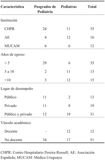 Se encuestaron 63 profesionales (35 en el CHPR, 16 en la AE y 12 en la MUCAM), de los cuales 34 eran posgrados y 29 pediatras; entre los pediatras, 12 eran docentes. Refirieron desempeñar su actividad en el ámbito público 13, en el privado 19 y en ambos 31. En la (Tabla 1) se resumen las características de los encuestados.