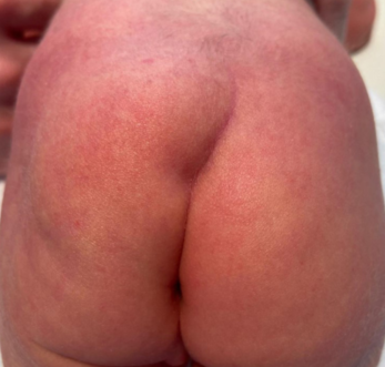 Durante su ingreso se realiza estudio ecográfico en el que se objetiva una masa grasa subcutánea en región glútea izquierda adyacente al pliegue interglúteo, que se continúa a través de un defecto de fusión de los elementos posteriores espinales con el saco tecal y el cono medular, que se muestra descendido (Figura 2). Estos hallazgos son compatibles con la presencia de un lipomielomeningocele y una médula anclada a la altura de L5, por lo que ampliamos el estudio con resonancia magnética (RM) (Figura 3) confirmando la presencia de un disrafismo espinal cerrado.