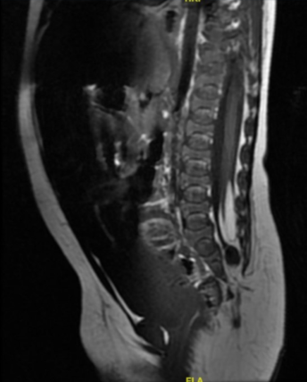 Figura 3: RM medular. Anclaje medular L5 con lipoma intradural L3-L5 rodeando al cono y dilatación quística distal al cono y al lipoma. Defectos de elementos posteriores sacrococcígeos