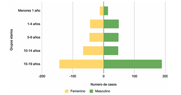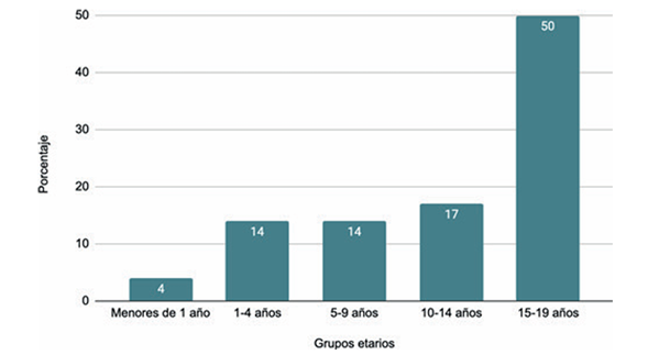 Se identificaron 660 casos de TB en niños y adolescentes en el período de estudio. La media de edad fue de 12 años y la mediana de 15 años (DE 6,24). El 50% de los casos del período tienen de 15 a 19 años (Figura 1). La distribución de casos de TB y la tasa de incidencia por grupos etarios se muestra en la (Tabla 1).