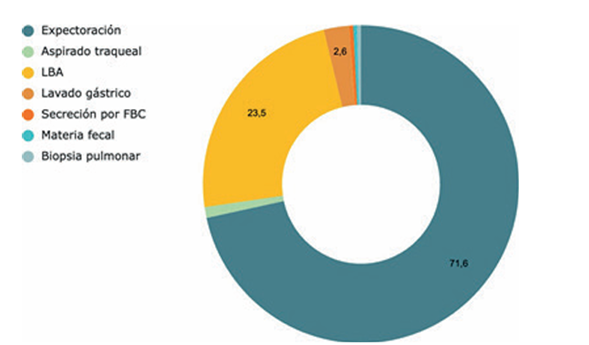 De los 660 pacientes, el 84% tiene al menos una muestra enviada al LNR para confirmación bacteriológica. En el caso de los pacientes con formas pulmonares, la confirmación se alcanzó a partir de muestras de expectoración en el 71,6% de los casos, seguido por muestras de lavado bronquioalveolar (LBA) en 23,5% de los casos (Figura 3).