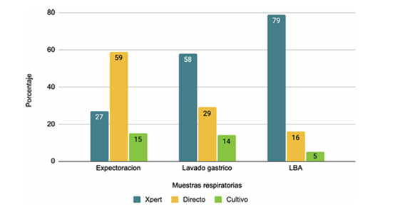 El porcentaje de confirmación bacteriológica con pruebas moleculares rápidas, como el GeneXpert MTB/Rif Ultra, varía de acuerdo a las muestras. El 27% de los casos confirmados en muestras de expectoración se realizó por GeneXpert, mientras que este porcentaje aumenta a 79% en el caso de muestras de LBA (Figura 4).