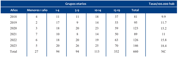 Tabla 2 Distribución de casos de tuberculosis en niños y adolescentes por año en municipios de Montevideo. 2018-2023.
