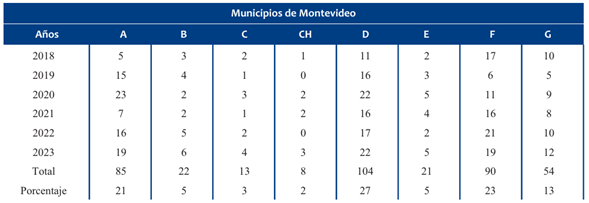 La distribución geográfica muestra un predominio de casos diagnosticados en residentes de Montevideo (425 casos, 64%) con una diferencia estadísticamente significativa (p <0,005) en comparación con los casos en el interior del país. Los municipios A, D y F son los que concentran la mayor cantidad de casos de Montevideo (21%, 27% y 23%, respectivamente). En la (Tabla 2) se muestra la distribución de casos por año en municipios de Montevideo.