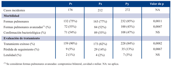 Entre el período P1 y el P2, el aumento de casos de TB fue de 20,4%, y entre el P2 y P3 el aumento fue de 28,4%, siendo este incremento estadísticamente significativo entre los períodos. La localización pulmonar de la enfermedad aumentó progresivamente en los tres períodos y las formas pulmonares avanzadas descendieron, presentando ambas variables significancia estadística.