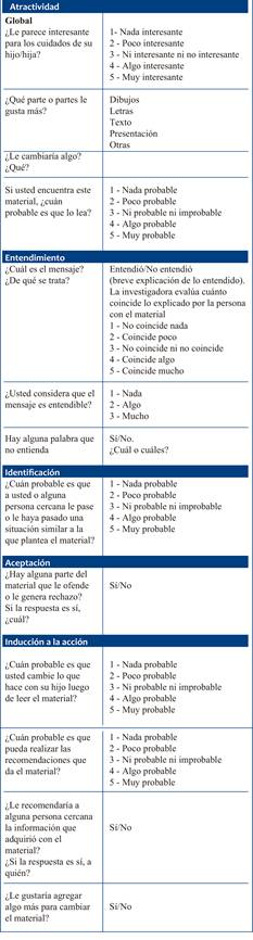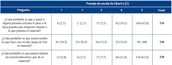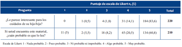 se realizaron 220 entrevistas. La mediana de edad de los cuidadores primarios fue 30 años, de género femenino 198 (90%) y madres 176 (80%). A 215 (98%) personas les pareció interesante el material. Consideraron probable leerlo por su cuenta 179 (81,4%). Las investigadoras interpretaron que la expresión de las entrevistadas coincidía con el mensaje en 90,9%. Los cuidadores consideraron que entendían el mensaje en el 92,7% de los casos. Consideraron probable que le pasara la situación planteada en el material 191 personas (86,8%). Refirieron que era muy probable que este material sirviera para modificar su accionar el 40%.