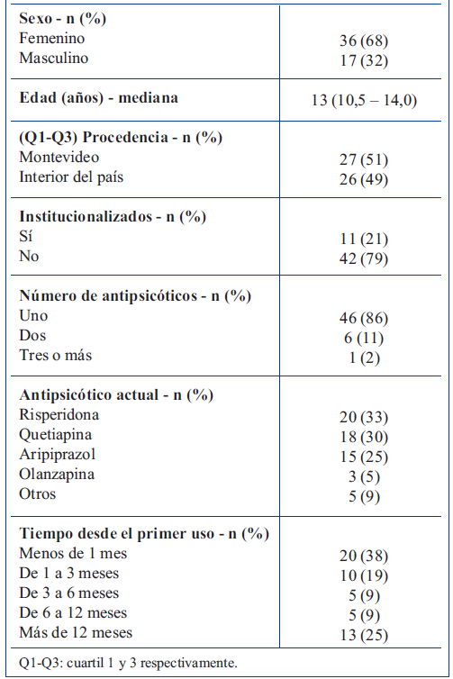 El 86% (46) refirió que actualmente utilizaba un único antipsicótico, mientras que 11% (6) refirió utilizar dos. El 33% (20) de los participantes utilizaba al momento de la encuesta risperidona, 30% (18) quetiapina y 25% (15) aripiprazol. El 38% (20) de los participantes había comenzado a utilizar el antipsicótico hacía menos de un mes, mientras que 25% (13) de ellos lo utilizaba desde más de 12 meses. La mediana del tiempo de uso del antipsicótico para aquellos participantes que lo utilizaban desde hacía más de 12 meses fue de 4 años (1,0 - 6,0 años).