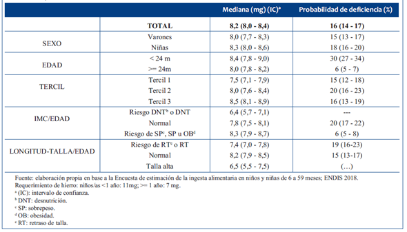 Asimismo, los niños y niñas con riesgo de retraso de crecimiento o retraso de crecimiento (longitud-talla/edad) tuvieron un consumo de hierro menor respecto a los niños con una talla adecuada a su edad, 7,4 mg y 8,2 mg respectivamente, diferencia significativa.