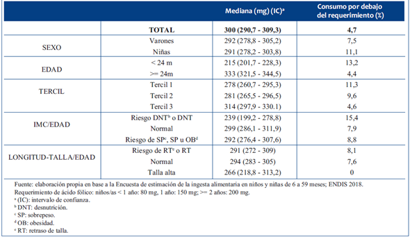 El 4,7% de niños y niñas tuvieron una ingesta de ácido fólico por debajo de su requerimiento. Este porcentaje de deficiencia aumentó a 13,2% en niños y niñas de entre 6 y 23 meses, y disminuyó a 4,4% en niños y niñas de 24 a 59 meses.