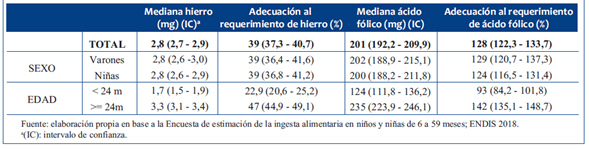 iron and folic acid deficiency primarily affects children under 2 years of age, those with poor nutritional status, and those from lower socioeconomic strata. Although the food typess included in Law 18.071 contribute to meeting iron and folic acid needs, their contribution is not sufficient, making it important to strengthen other public health measures.