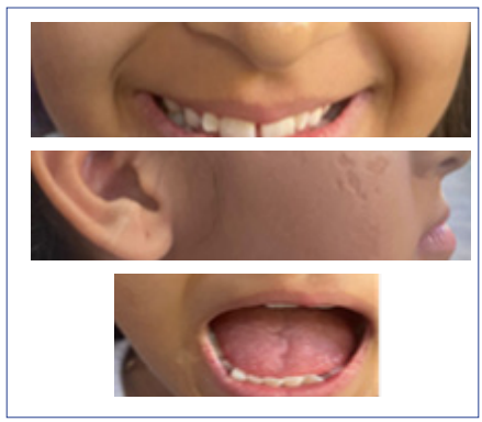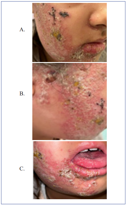 Figura 1: Lesiones vesiculosas y costra localizadas en cara a nivel del dermatoma de la rama mandibular del trigémino. A. Vesículas en fase costrosa, con eritema y superficie cutánea rugosa a nivel del dermatomo de rama V3 del nervio trigémino. B. Lesiones vesiculares en región del trago y raíz del hélix. C. Lesiones vesiculares eritematosas en región derecha de la lengua. Fotografía autorizada por madre y paciente.