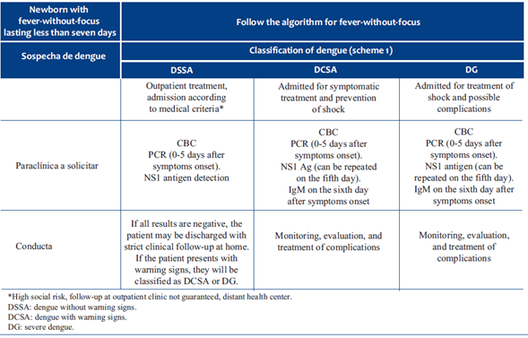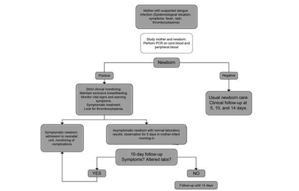 If the newborn has a fever, they should be admitted to a vector-isolated area where proper monitoring, evaluation, and management of complications can be ensured. (Table 2) summarizes the steps to follow for newborns with suspected postnatal dengue.