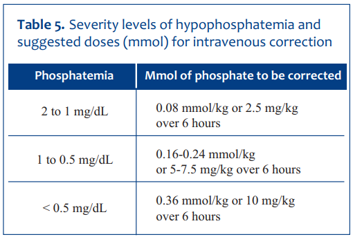 Table 5 shows the suggested phosphate doses (in mmol) according to the degree of plasma phosphate depletion in children12-19.