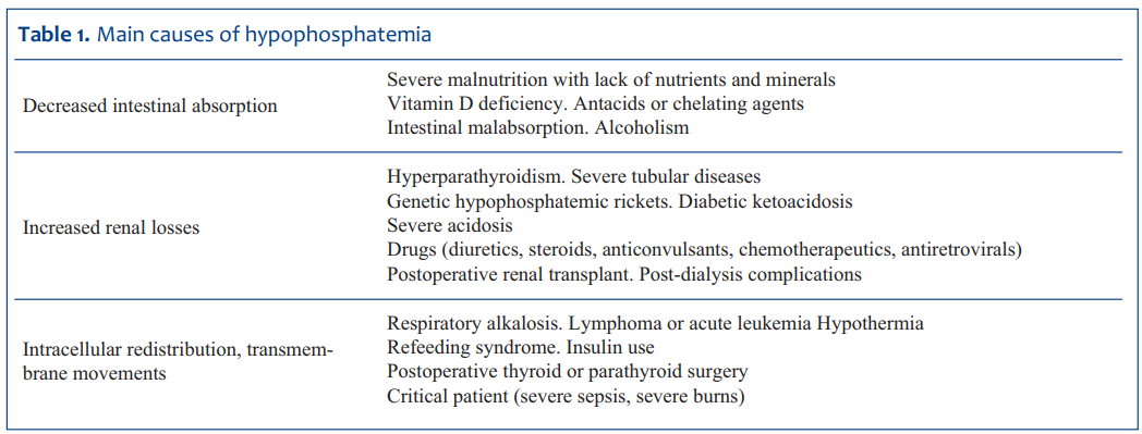 Table 1 lists the main causes of hypophosphatemia in the three categories mentioned above.