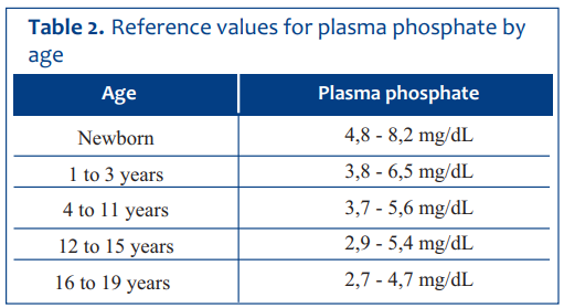 Plasma phosphate levels depend on age, being higher in young children and adolescents. In adults, they range from 2.5 to 4.5 mg/dL (0.81-1.45 mmol/L)8. Hypoalbuminemia decreases plasma levels. Table 2 details reference ranges in pediatrics, although it is recommended to use reference tables specific to each hospital laboratory9.
