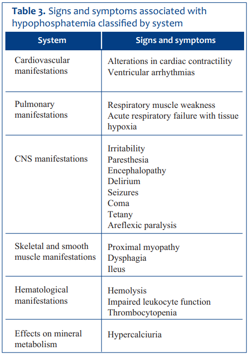 Deficiency may lead to cardiorespiratory dysfunction and arrhythmias, as well as a decrease in diphosphoglycerate, which increases hemoglobin’s affinity for oxygen, thereby promoting tissue hypoxia10. Acute hypophosphatemia without prior chronic phosphate depletion is not usually symptomatic8. Table 3 details the main symptoms attributable to severe hypophosphatemia, organized by system11.