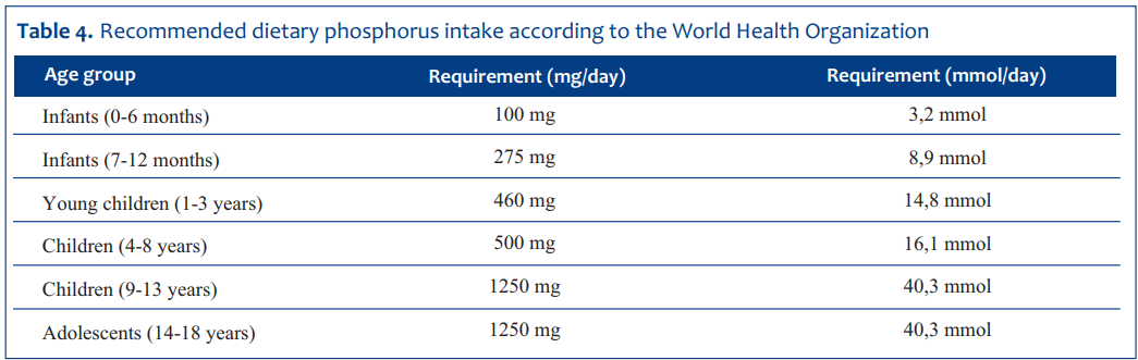 Table 4 shows the recommended dietary phosphorus intake by age, expressed in mg and mmol per day.