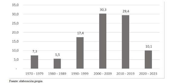 Se observa un aumento del número de documentos a medida que avanza la línea temporal. En la década de 1990 (Figura 1), Uruguay duplica lo emitido en los años 70, para alcanzar su mayor producción a partir del 2000. Entre 2000 y 2019, los documentos que incluyen recomendaciones de duración de lactancia representan el 60%. Esto coincide con la incorporación progresiva de las recomendaciones de la OMS a las políticas públicas en Uruguay. Desde lo expresado en la Declaración de Inocentti8, y más tarde en la 47ª Asamblea Mundial de Salud (AMS) que emite la recomendación de exclusividad durante los primeros 6 meses y la duración total hasta 24 meses, lo que en el año 2000 se amplía por encima de los 24 meses (Figura 1).