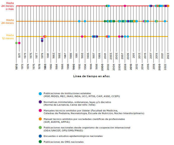 La revisión documental permitió reconocer el proceso que han atravesado las recomendaciones sobre la duración de la lactancia en Uruguay, desde 1970 a 2023. Estas se han plasmado en documentos de diferentes categorías, donde se destacan tres grandes grupos: documentos emitidos por instituciones estatales que hacen rectoría sobre la atención en salud y bienestar de las infancias, documentos emitidos por la academia y por organismos de cooperación internacional con representación nacional asociados a salud, desarrollo y derechos de niños y niñas.