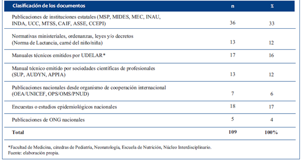 Se obtuvo un total de 189 documentos. Fueron eliminados 14 por no cumplir con criterios de inclusión, 66 excluidos por repetidos, resultando 109 documentos. El 33% son publicaciones emitidas por instituciones del Estado (Tabla 1). El 17% corresponde a encuestas o estudios epidemiológicos nacionales sobre lactancia, que expresan una postura acerca de su duración y miden el tiempo como indicador poblacional. Los manuales o pautas técnicas emitidas por la UDELAR para formación de profesionales de pediatría, neonatología, nutrición (16%). No se identifican documentos originados desde facultades de Psicología, Odontología y Enfermería. El 12% de los documentos corresponden a normativas, ordenanzas ministeriales, leyes o decretos. Otro 12% proviene de manuales o pautas técnicas emitidas o desde sociedades científicas, predominantemente a Sociedad Uruguaya de Pediatría (SUP). El 6% proviene de organismos de cooperación internacional: Organización de Estados Americanos (OEA), UNICEF, Organización Panamericana de la Salud (OPS), Programa de Naciones Unidas para el desarrollo (PNUD). Cinco documentos (4%) fueron emitidos por la Red Uruguaya de Apoyo a la Nutrición y Desarrollo Infantil (RUANDI).