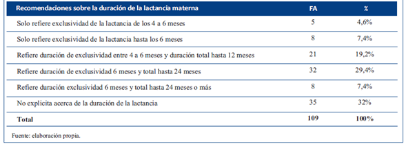De los 109 documentos, 35 (32%) no expresan recomendación explícita acerca de la duración. Los 74 documentos restantes sí lo hacen (68%). Las expresiones asociadas a la duración refieren tanto a la exclusividad como a la duración total (Tabla 2). El 12% de los documentos expresan únicamente tiempo recomendado para la exclusividad. De estos, 4,6% expresa la exclusividad entre 4 y 6 meses y 7,4% establece los 6 meses. El 56% de los documentos suma a la recomendación de exclusividad la duración total. Casi un 20% expresa la recomendación de duración hasta los 12 meses, mientras que casi el 30% expresa una duración total de 24 meses, siendo el 7,4% los que expresan una recomendación de 24 meses o más (Tabla 2).