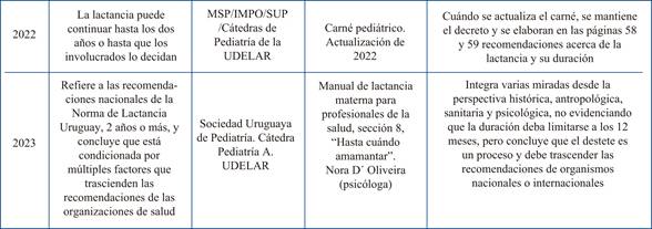 En 2020, un manual técnico de las cátedras de Pediatría cita las recomendaciones del MSP y señala explícitamente una duración total de 24 meses o más. En 2023, la SUP y la Clínica A de Pediatría publican el Manual de lactancia para profesionales de la salud con el aval de las instituciones estatales, academia, organizaciones de la sociedad civil y cooperación internacional, donde se expresa una duración de la lactancia de dos años o más. La autora de ese capítulo, psicóloga y experta en lactancia, incluye las perspectivas multidisciplinarias desde la historia, antropología, ciencias médicas y psicología, y menciona que no hay evidencias fuertes de que la lactancia deba limitarse a 12 meses. Concluye que “el cese de la lactancia o el destete es un proceso y debe trascender las recomendaciones de organismos nacionales o internacionales”44.