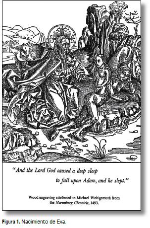 Esta interpretación del texto bíblico, por parte de un grabador alemán a fines del siglo XV, podemos comentarla. Por un lado, Dios sería el primer anestesista, ya que sumió a Adán en un profundo sueño; y también fue el primer obstetra, ya que extrajo a Eva de su costado y luego cerró su carne. Por otra parte, este artista, adelantándose cinco siglos a los conocimientos de fisiopatología obstétrica que tenemos hoy en día, coloca a Adán, en posición decúbito lateral. Sería, quizá, para evitar el síndrome de compresión aorto-cava.