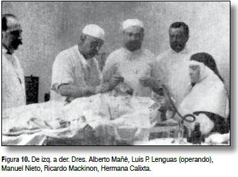 En la fotografía (figura 10), tomada en 1912, vemos al Dr. Alberto Mañé, padre del conocido pediatra Fernando Mañé Garzón. Se trata de una intervención en la sala de mujeres Mateo Vidal, donde se puede observar a la hermana Calixta administrando una anestesia clorofórmica, usando el aparato de Ricard.