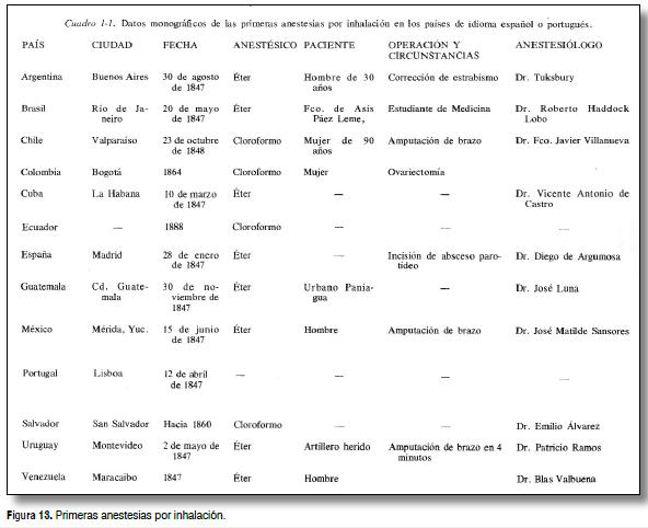 En este cuadro del libro de Antonio Aldrete (22), profesor de Anestesiología de la Universidad de Alabama, en Birmingham EE.UU., que titula Cuadro monográfico de las primeras anestesias por inhalación realizadas en los países de habla hispanoportuguesa, vemos que figura nuestro país, con la primera anestesia realizada en Montevideo, el 2 de mayo de 1847, utilizando el éter en un artillero herido, a quien le practican una amputación de brazo, figurando como anestesista el Dr. Patricio Ramos. Si revisamos este cuadro, vemos que en la mayoría de estos países, la fecha coincide con la nuestra, 1847, es decir, poco tiempo después de la célebre demostración de Morton, en el Massachussets General Hospital en Boston.